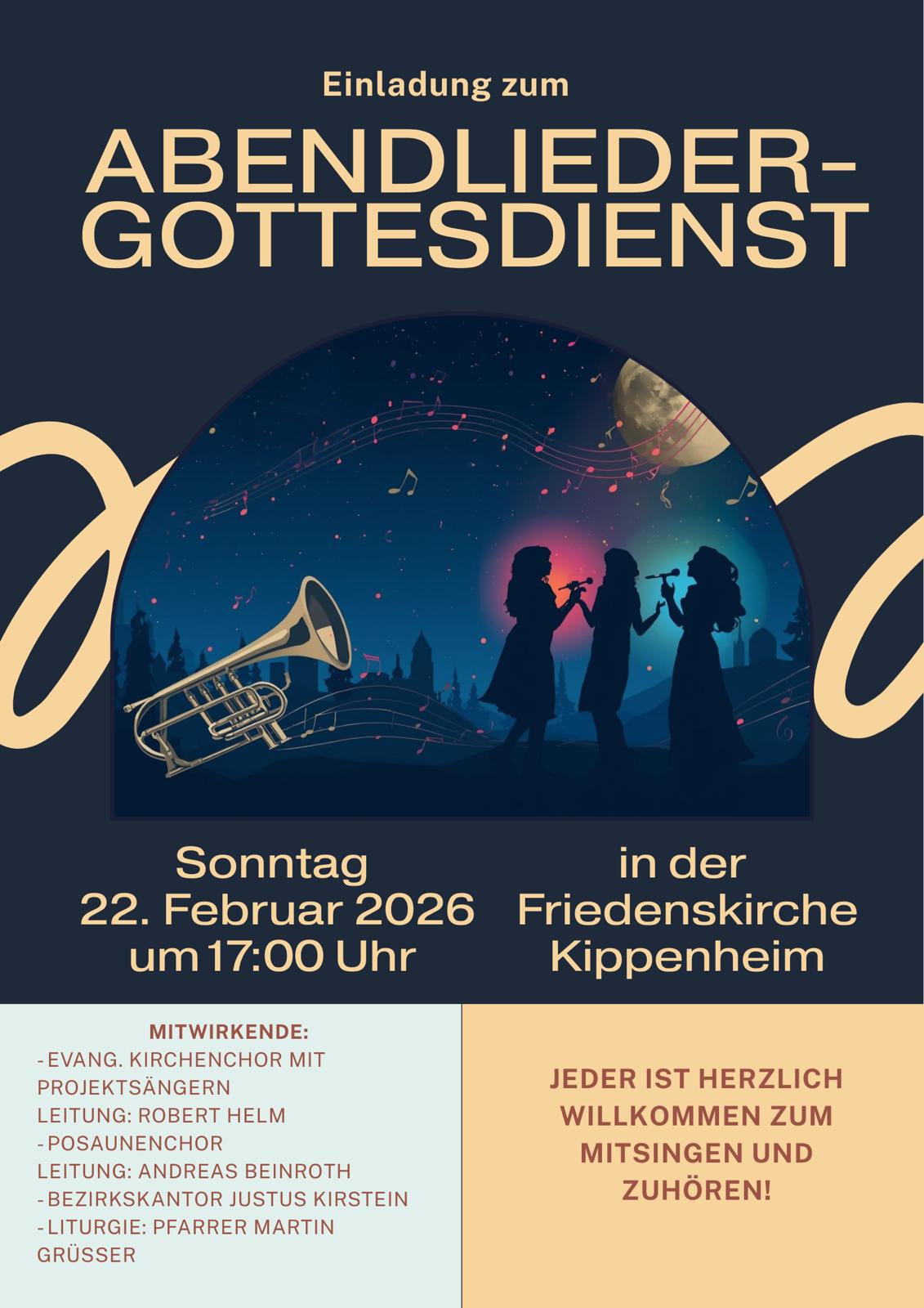 am 22. Februar in einem Abendlieder-Gottesdienst um 17.00 Uhr in der Friedenskirche Kippenheim aufgeführt, bei dem auch der Posaunenchor Kippenheim mitwirken wird.